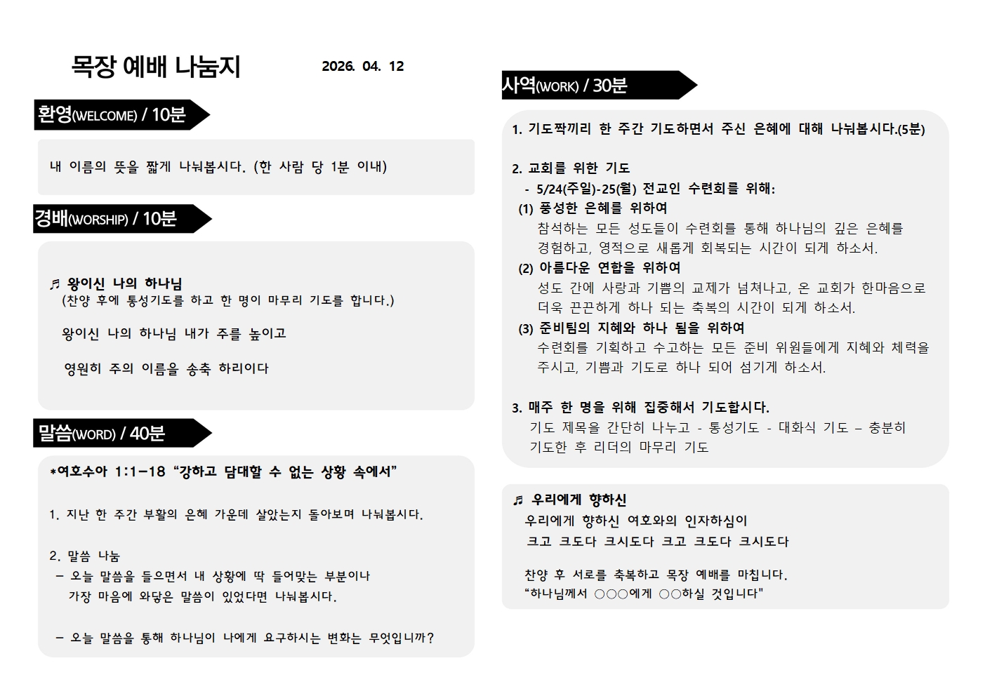 2026.04.12 목장예배나눔지 페이지 정보 작성자최고관리자 댓글0건 조회20회 작성일.1.11.30 00:00 본문 공유 다음글2026.04.05 목장예배나눔지 00.00.00 댓글 0 댓글목록 등록된 댓글이 없습니다.