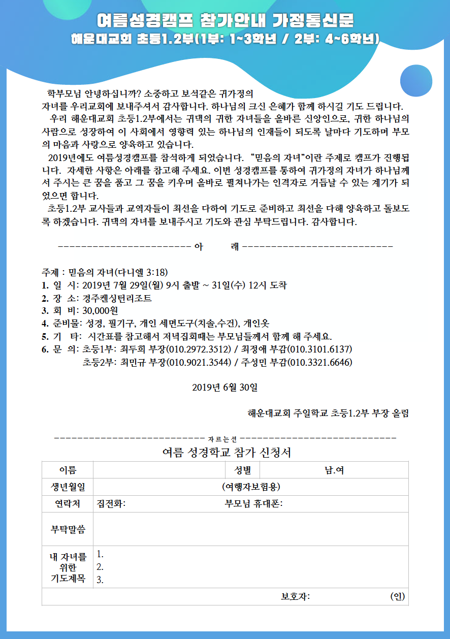 [초등부] 여름성경캠프 - 가정통신문 작성일19.07.03 15:34 본문 공유 여름성경캠프 - 가정통신문 이전글여름수련회 - Bridge 19.07.03 다음글여름성경캠프 - 가정통신문 19.07.03