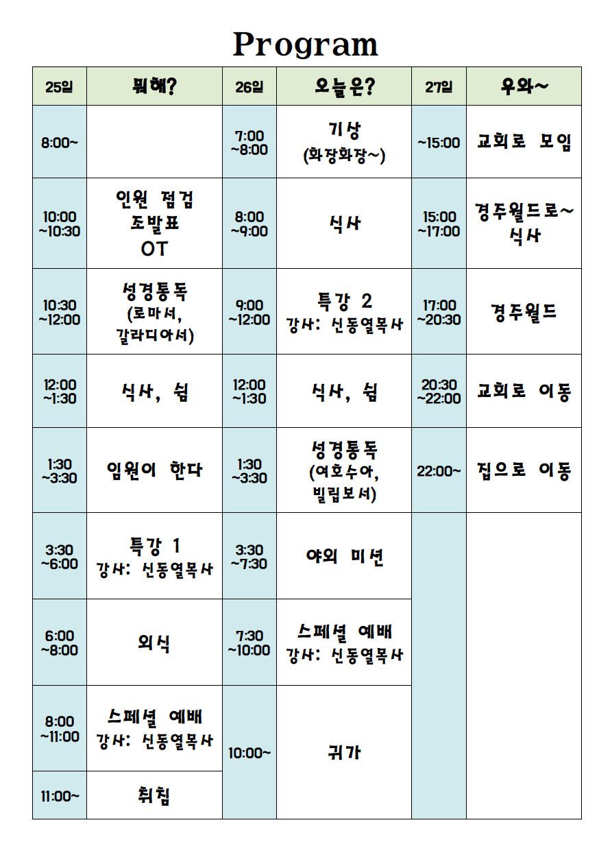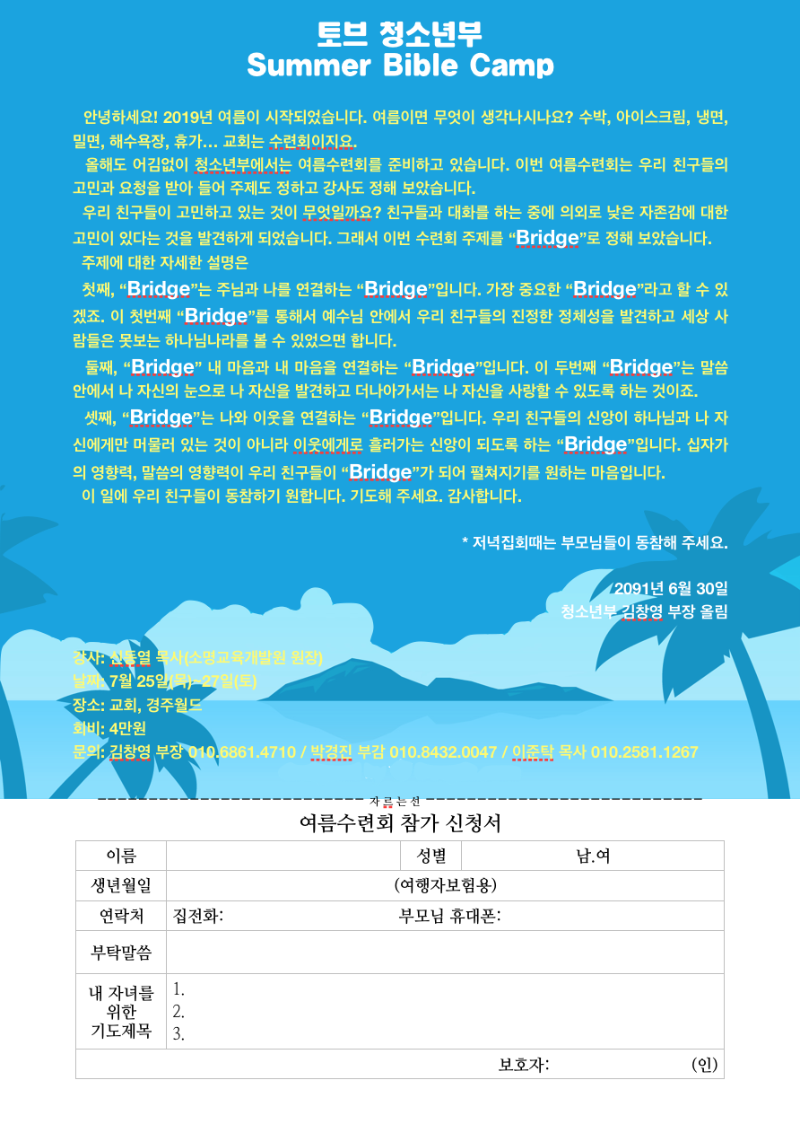 [청소년부] 여름수련회 - Bridge 가정통신문 작성일19.07.03 15:37 본문 공유 기도 많이 해 주세요 이전글7월 7일 유치부 예배 19.07.07 다음글여름수련회 - Bridge 19.07.03