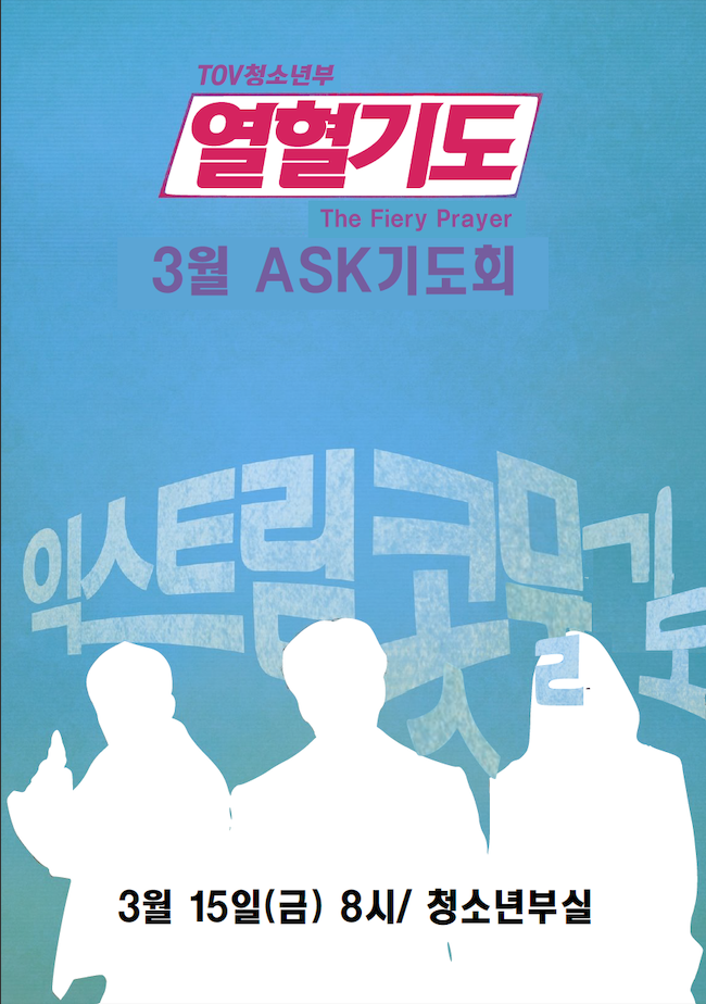 [청소년부] 3월 ASK기도회 "열혈기도" 작성일19.03.13 12:14 본문 공유 3월 ASK기도회3월 15일(금) 8시열혈적으로다가 기도합시다~익스트림 콧물기도 ㅋㅋㅋ 이전글3월 대심방 19.03.14 다음글다음세대 소식입니다 19.03.06