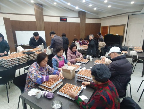 부활절 계란 포장하는 권사님들과 교역자들